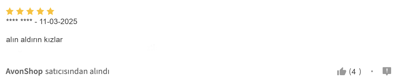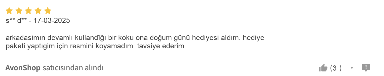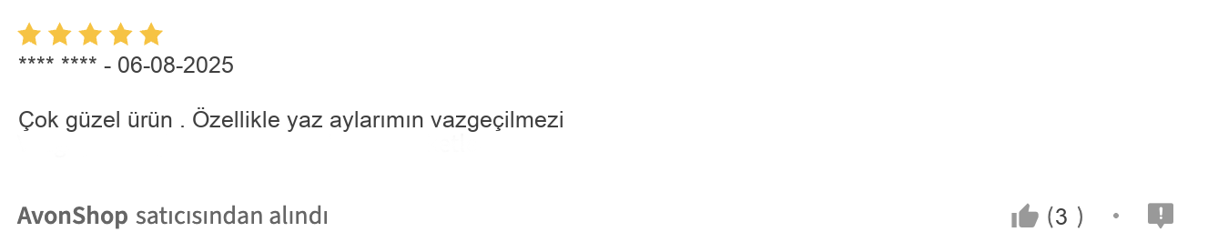 Özellikle çiçeksi parfüm ve oryantal koku karışımını sevenler için birebir olan bu deodorant, AVON’un yıllardır güvendiğimiz kalitesini günlük kullanıma taşıyor. Üstelik pratik roll on formuyla uygulanması çok kolay. İster sabah hızlıca hazırlanırken, ister gün içinde taze bir ferahlık ararken yanınızda olması büyük rahatlık sağlıyor.