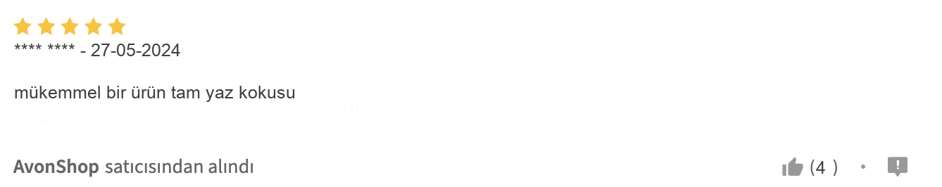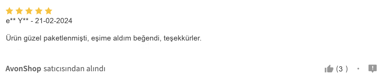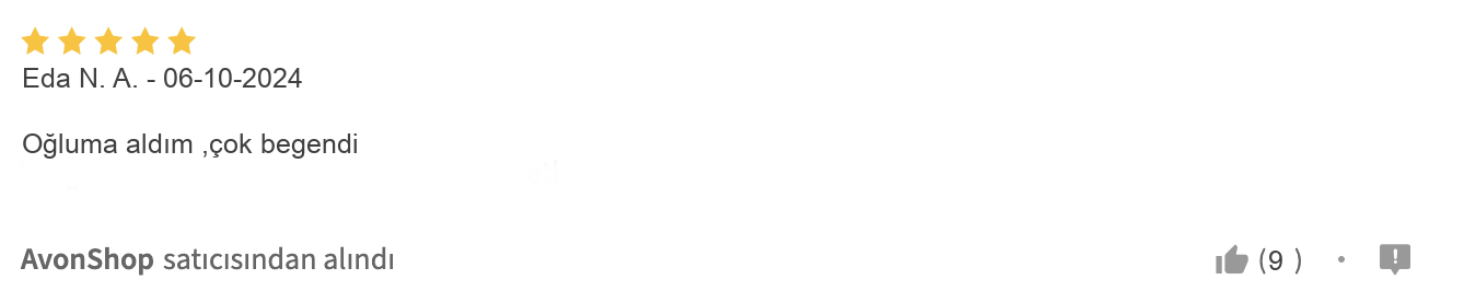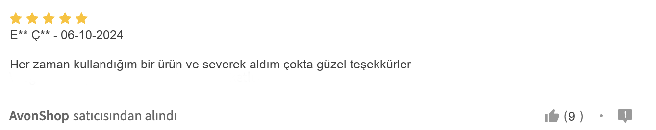 Kullanıcı yorumlarına baktığınızda, bu parfümün sadece kendilerine değil, hediye olarak da sıkça tercih edildiğini görebilirsiniz. Sevdiklerinize verilebilecek güvenilir ve şık bir hediye parfüm arayışında olanlar için de AVON parfüm seçenekleri arasındaki bu ürün, fiyat-performans açısından oldukça seviliyor. Kalitesi, kullanışlılığı ve uygun fiyatıyla öne çıkması kullanıcılar tarafından da sıkça vurgulanmış.
