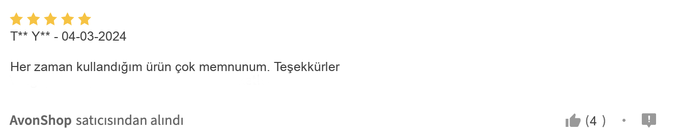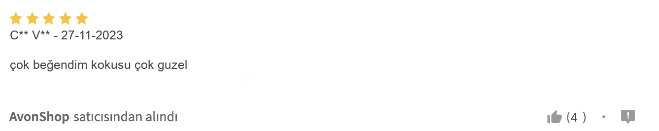 Hızlı uygulama imkanıyla gün içinde pratikliğe önem verenler için biçilmiş kaftan olan bu ferah rollon, 50 ml’lik ideal boyutuyla uzun süreli kullanım sunuyor ve çantanızda taşıması da oldukça kolay. Bu yönleriyle hem evde hem dışarıda size kolaylık sağlıyor. Kullanıcı yorumları AVON markasının kalitesini ve ürünün verdiği memnuniyeti bir kez daha teyit eder nitelikte: Kalıcı koku, güzel paketleme ve indirimli fiyat gibi avantajlar kullanıcılar arasında büyük beğeni kazanmış durumda.