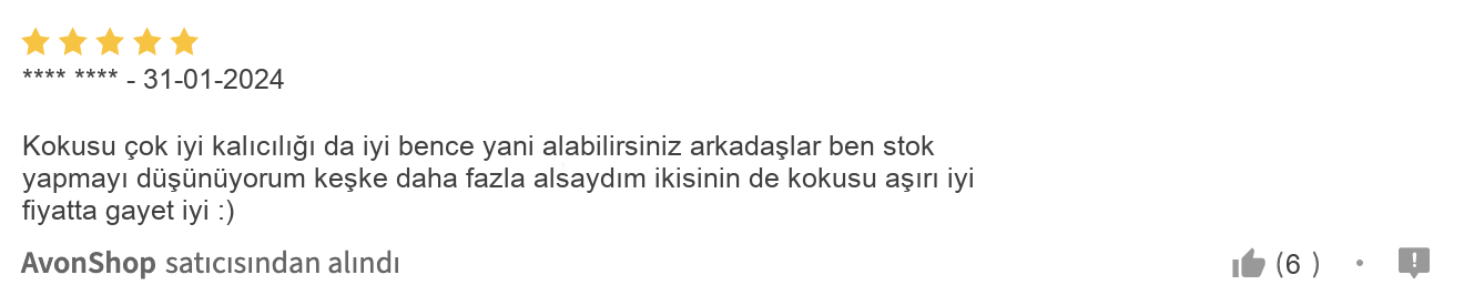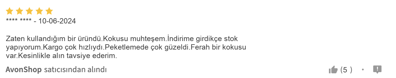 Avon kalitesini her yönüyle yansıtan bu ürün, kullanıcı yorumlarında da gördüğümüz üzere sadece kokusuyla değil, ambalajındaki özen ve çevre dostu yaklaşımıyla da gönülleri kazandı. Özellikle sürdürülebilir güzellik bilincine sahip olmak isteyenler için PCR materyalden yapılmış ambalajı büyük önem taşıyor. Üstelik, ürünün fiyat performans ürünü kimliği onu kumaş kadar dost, bütçe dostu yapıyor.