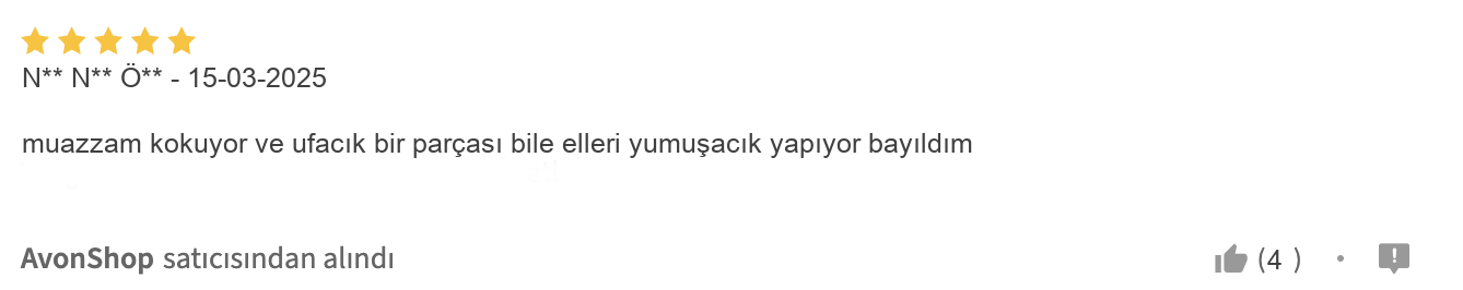 Ayrıca, AVON el kremi olarak rahatlıkla çantanıza atabileceğiniz tüp formdaki bu ürün sayesinde, evde ya da işte, günün her anında ellerinizi nemlendirip yumuşaklığını koruyabilirsiniz. Özellikle kuru tenler için krem ararken, böyle pratik ve etkili çözümler hayatı kolaylaştırıyor. Kremi kullananlar, ürünün kalıcı nemlendirme sağladığını ve ellerinin gün boyu yumuşak kaldığını dile getiriyor.