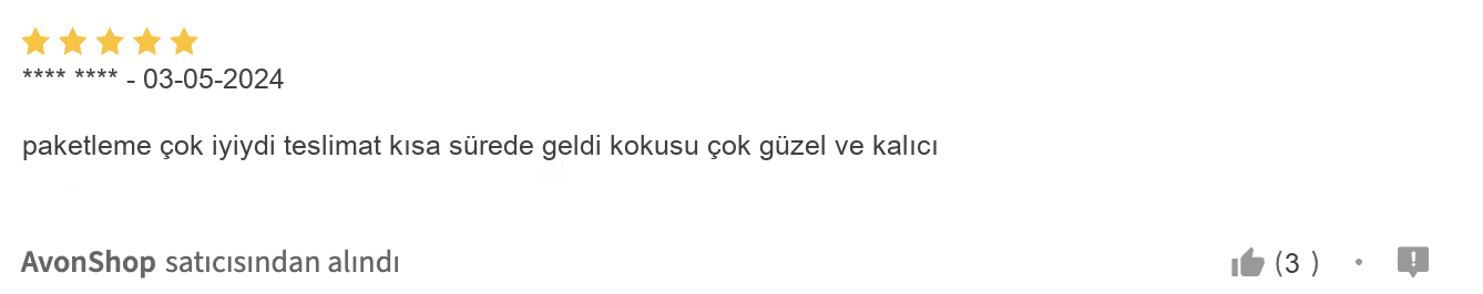 Satış yaptığımız mağazamızdaki parfüm kullanıcı yorumları, bu ürün için oldukça olumlu ve içten. Kullanıcıların neredeyse tamamı, kalıcılığından ve etkileyici, sıcak koku tonlarından bahsediyor. “Favori kokumdur, arkadaşlarım sürekli nereden aldığımı sorar”, “Hediye olarak satın aldım ve çok beğenildi”, “Kışın vazgeçilmezim oldu” gibi samimi ifadeler, seçim yaparken içinizi rahatlatıyor. Üstelik ürünün paketleme kalitesi ve teslimat hızı da alışveriş deneyimini mükemmelleştiriyor. Siz de deneyimleyenler kadar keyifli anlar yaşayabilirsiniz.