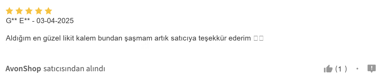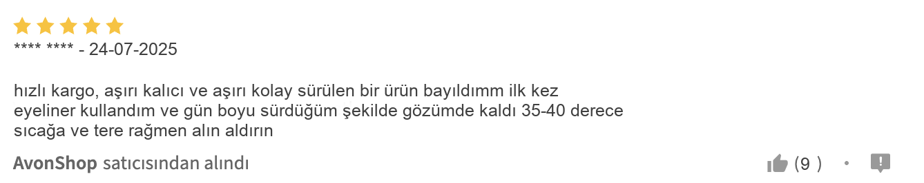Müşterilerin çoğu, ürünün sürümü kolay ve hızla kuruyan yapısını övüyor, özellikle ilk eyeliner deneyimini yaşayanlar bile başarıyla kullanabildiğinizi belirtiyorlar. Ayrıca, kargo süreçlerinin hızlı ve ürünlerin özenli paketlenmesi, Avon’un müşterilerini ne kadar önemsediğinin kanıtı. Ufak tefek ambalaj şikayetlerine rağmen, ürünün fiyat-performans dengesi ve kalıcı yapısı birçok kullanıcı tarafından memnuniyetle belirtiliyor. Bu da aldığınız ürünün karşılığını fazlasıyla verdiğinin güzel bir göstergesi.