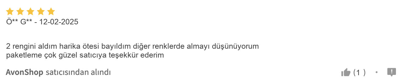 Avon ruj yorumları kısmında kullanıcılar renk canlılığı, kolay sürümü ve kalıcılığı özellikle vurguluyor. Paketlemenin özenli olması ve sorunsuz teslim diyenler, ürünün fiyat performans açısından da beklentileri karşıladığını belirtiyor. Siz de kaliteli ve uygun fiyatlı en iyi mat rujlar arasında arama yapıyorsanız, Ultra Mat Ruj – Berry Blast kesinlikle değerlendirilmesi gereken seçeneklerden biri.