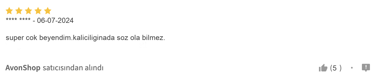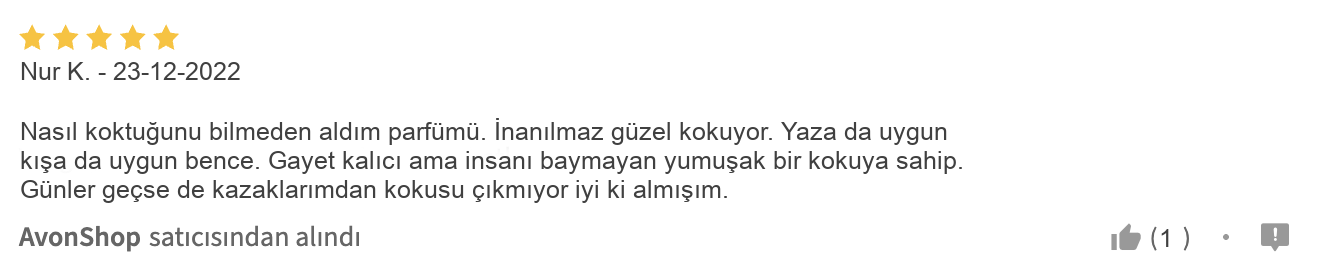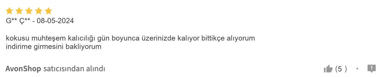 Bunun yanı sıra Avon’un özenle hazırladığı paketleme ve hızlı teslimat sistemi sayesinde, sevdiğiniz birine hediye parfüm olarak vermek de son derece keyifli ve güvenli. Üstelik fiyat performans dengesi sayesinde, kaliteli parfüm arayışında olanlar için oldukça cazip bir alternatif haline geliyor. Ürün sayfasında sıkça yapılan kampanyalar ve indirim fırsatlarıyla, bütçenizi zorlamadan yazın en ferah ve kalıcı parfümünü deneyimlemeniz mümkün.